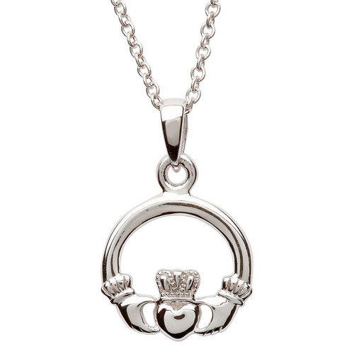 Beautiful and classic Claddagh necklace with hands, heart and crown fashioned from a brilliant Sterling Silver. Fine detail is featured in the fabrication.